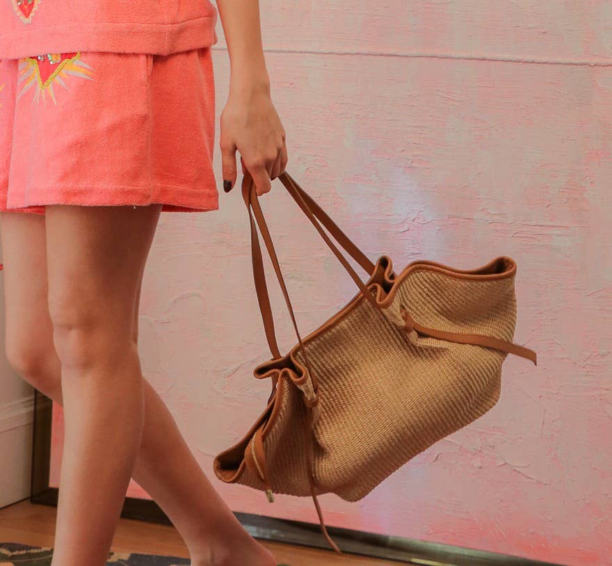 CINNAMON Einkaufstasche Raffia Natur - Kalbsleder-Griff Made in Italy